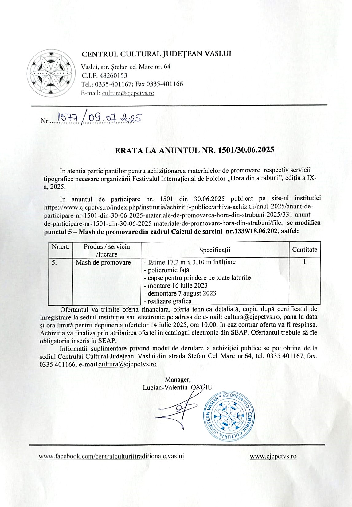 Anunt de participare nr 1501 din 30 06 2025 Materiale de promovare Hora din strabuni